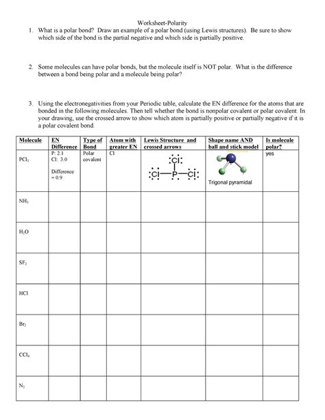 Using a worksheet to understand bond polarity is a great way to visualize the concept and how it works. By looking at the electronegativities of two atoms and the difference between them, it's easy to determine whether a bond is polar or non-polar. With this knowledge, we can better understand the nature of chemical interactions and how they affect the properties of molecules.